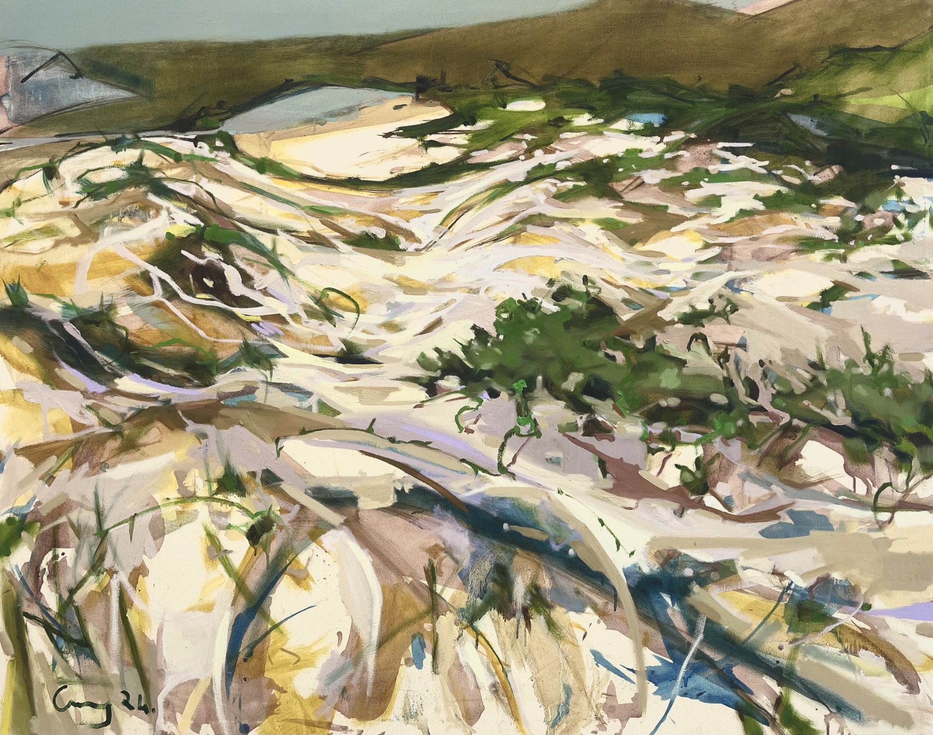"Short Point in True Green" is a richly layered oil on canvas. With expressive marks and earthy tones, it captures the essence of a coastal headland—where land meets sea under shifting skies.