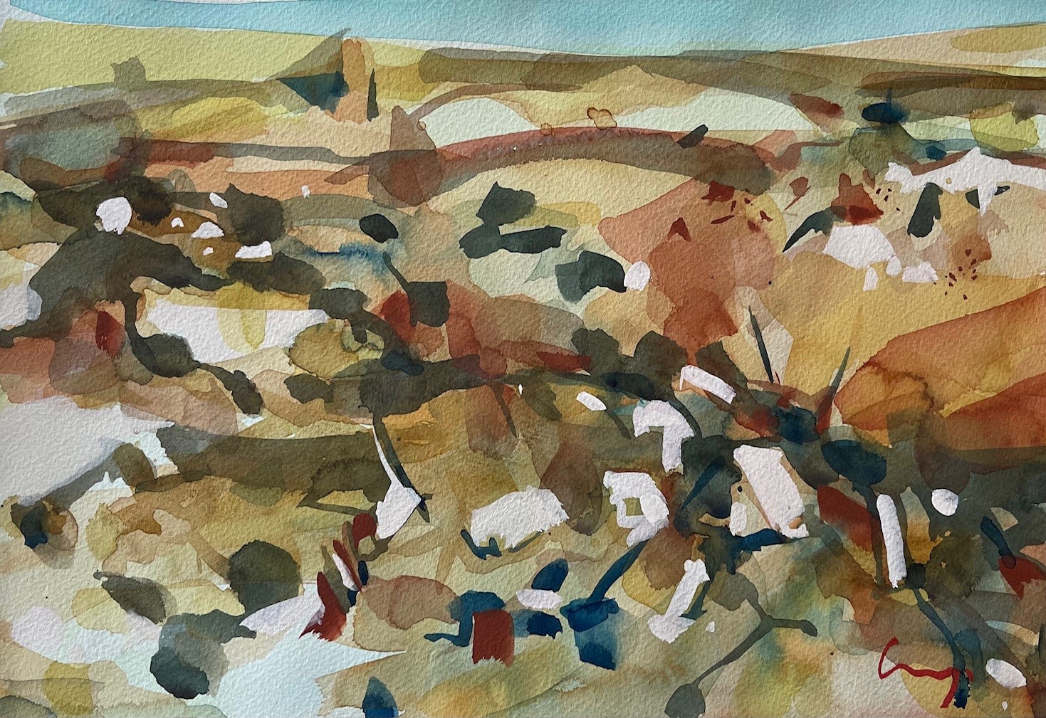 "Gully" is an award-recognised watercolour and gouache on paper. With layered washes and intricate textures, it captures the subtle shifts and channels of a carved landscape—where water and time have etched a quiet story into the land.