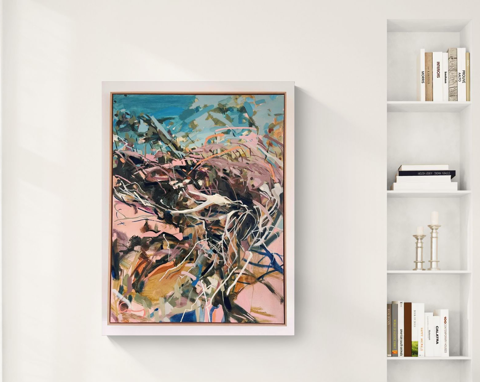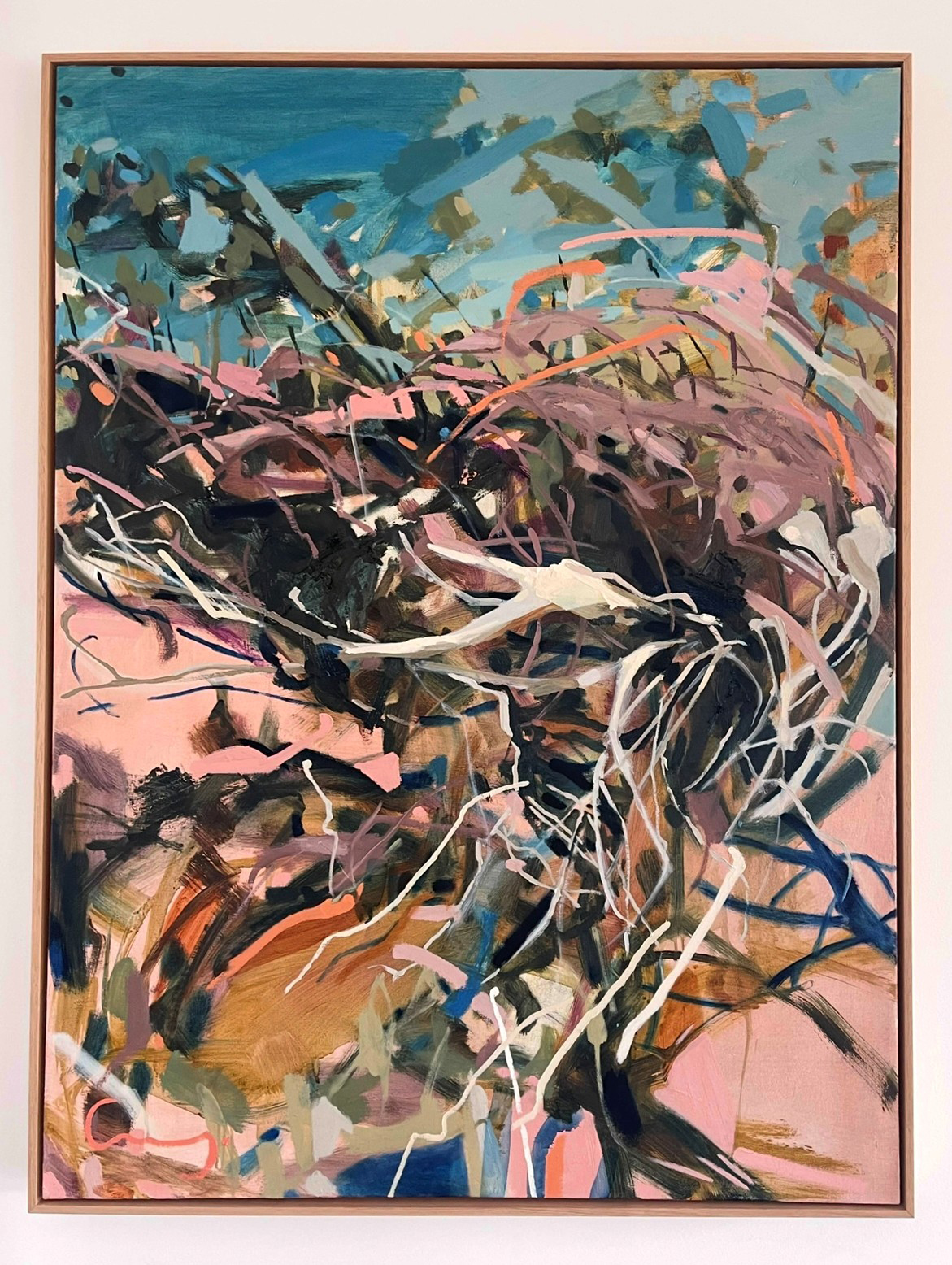 "Fallen" captures a tangle of blackberry and fallen logs in energetic sweeps of colour and line. Layers of movement suggest the way nature reshapes itself—branches, vines and groundcover twisting together in a living landscape. A dynamic and earthy composition.